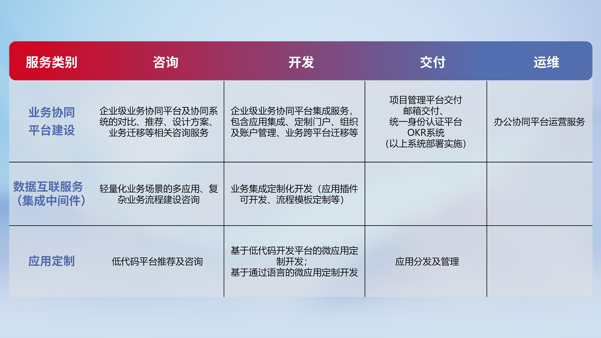 针对钉钉、、企微、、、、IDaas等平台级产品提供产品的规划、、方案、、、、交付、、定制化开发等服务,,实现如统一协同办公、、、、智能客户服务、、、混合会议管理、、、、智能数据查询、、、、等业务场景,,,,实现数字化转型。。。